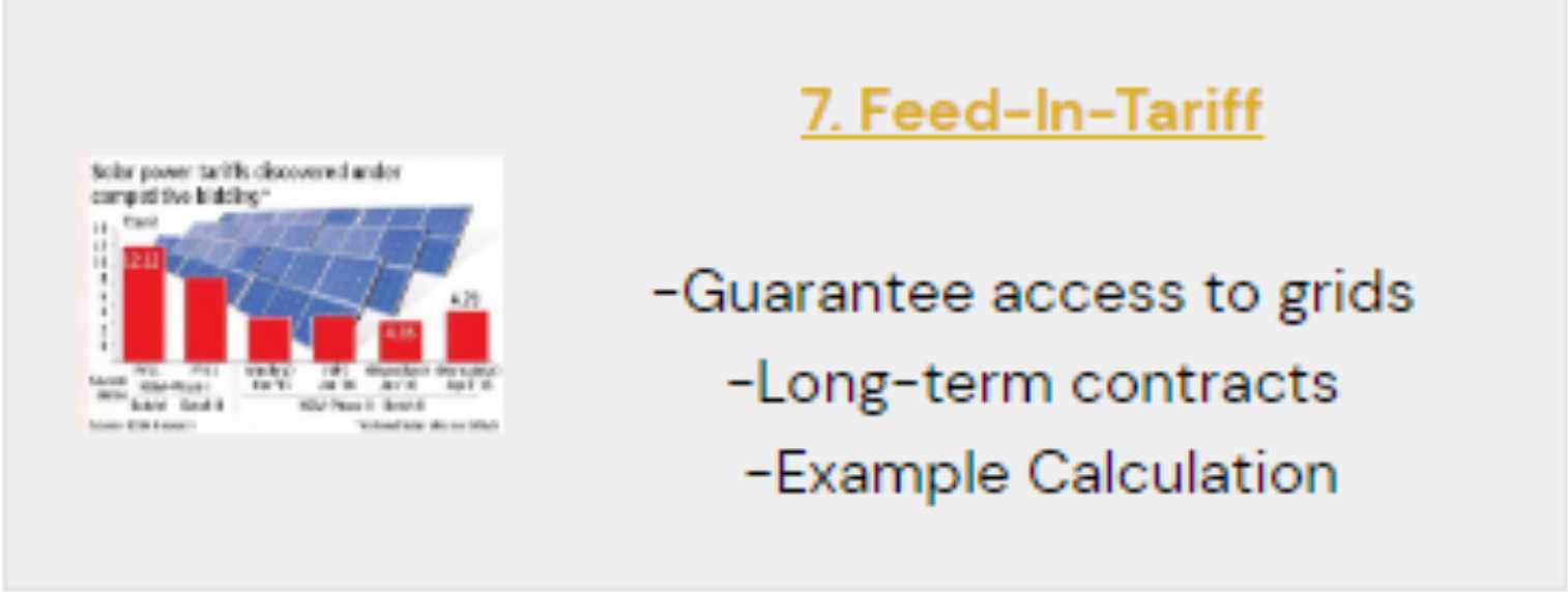 Feed-in Tariff, Auctions, PTC, and the electricity market.